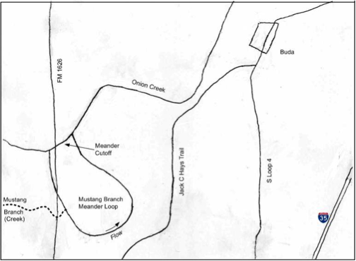 Onion Creek originates in the Texas Hill Country and flows generally eastward, joining the Colorado River southeast of Austin. Where the stream crosses the Balcones Escarpment, it displays an outstanding geomorphic feature, a prominent cutoff meander loop. It is located about two miles southwest of Buda and west of Interstate 35 (Figure 1). Texas FM 1626 crosses one leg of the loop. Although Onion Creek no longer flows through the former channel, a smaller tributary stream, Mustang Branch (also called Mustang Creek), enters and flows southward and then around the loop of the meander. The geomorphic feature is therefore named the Mustang Branch Meander Loop (MBML).