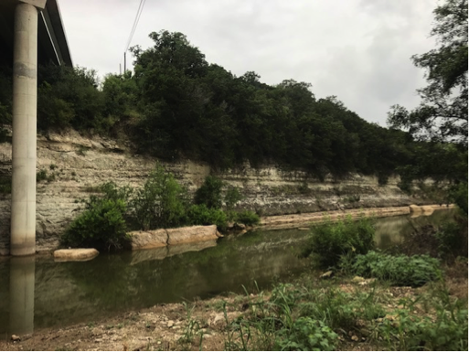 The cut bank formed in the Austin chalk, which is resistant to erosion in the upper part and forms a cliff at the top of the bank. Since the meander was cut off, cut bank erosion has greatly diminished, and an apron of colluvium has accumulated at the base of the upper cliff. The Sprinkle clay overlies the Austin chalk at the top of the cliff. The current channel of Onion Creek is on the Georgetown formation at and around the meander cut off location (Figure 5) and is therefore an actively downcutting stream in this stretch.