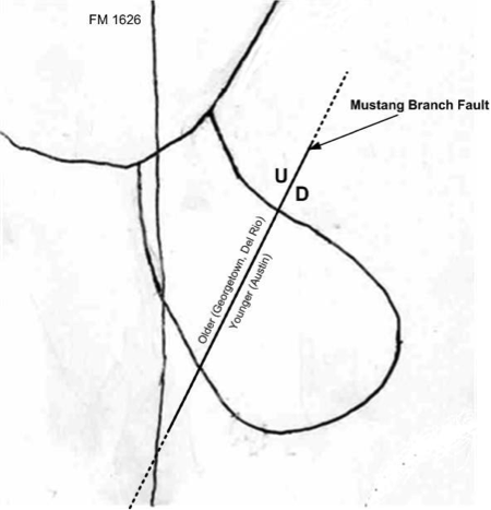 The MBML crosses a major northeast-trending BFZ fault, referred to here as the Mustang Branch fault, twice in its arcuate course (Figure 3). Younger strata of the Austin chalk on the southeast side of the fault are downfaulted against the older Georgetown formation and Del Rio clay on the northwest side. The Eagle Ford clay has not been observed and appears to be “faulted out” by the Mustang Branch fault. The Sprinkle Clay overlies the Austin chalk on the south side of the MBML.