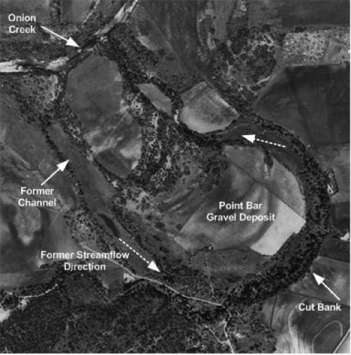 The MBML exhibits many features characteristic of a fluvial meander loop, including an abandoned channel, point bar gravel deposits, and a cut bank (Figure 4). The meander cutoff is between two parts of the former MBML channel (indicated by the “Onion Creek” label in Figure 4).