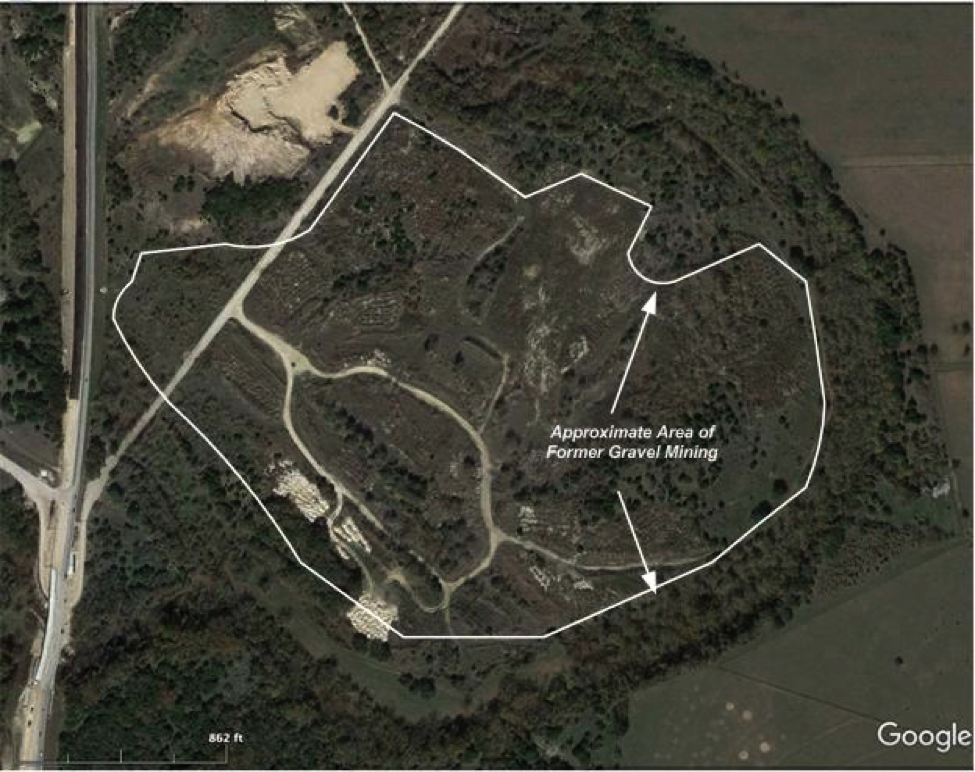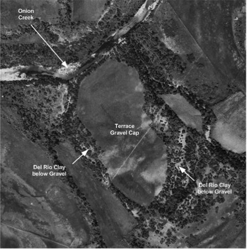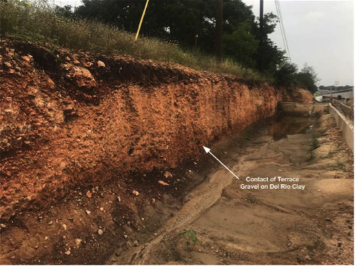 In addition to the relict geomorphic features of the MBML, there is evidence of older fluvial activity of Onion Creek. A higher-elevation terrace gravel is located on the inside of the loop adjacent to Onion Creek (Figure 6). The gravel is deposited on the Del Rio clay (Figure 7).